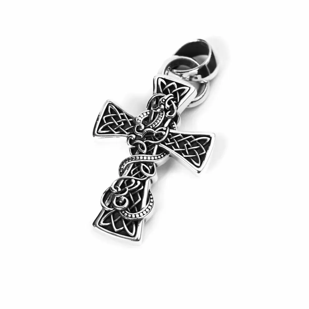 This cross uses a gothic design but adds a Celtic snake coiled around the cross, which makes it look powerful and luxurious at the same time. The intricate craftsmanship and the high contrast between the blacks and the silver really make this Celtic mythology inspired cross pop.