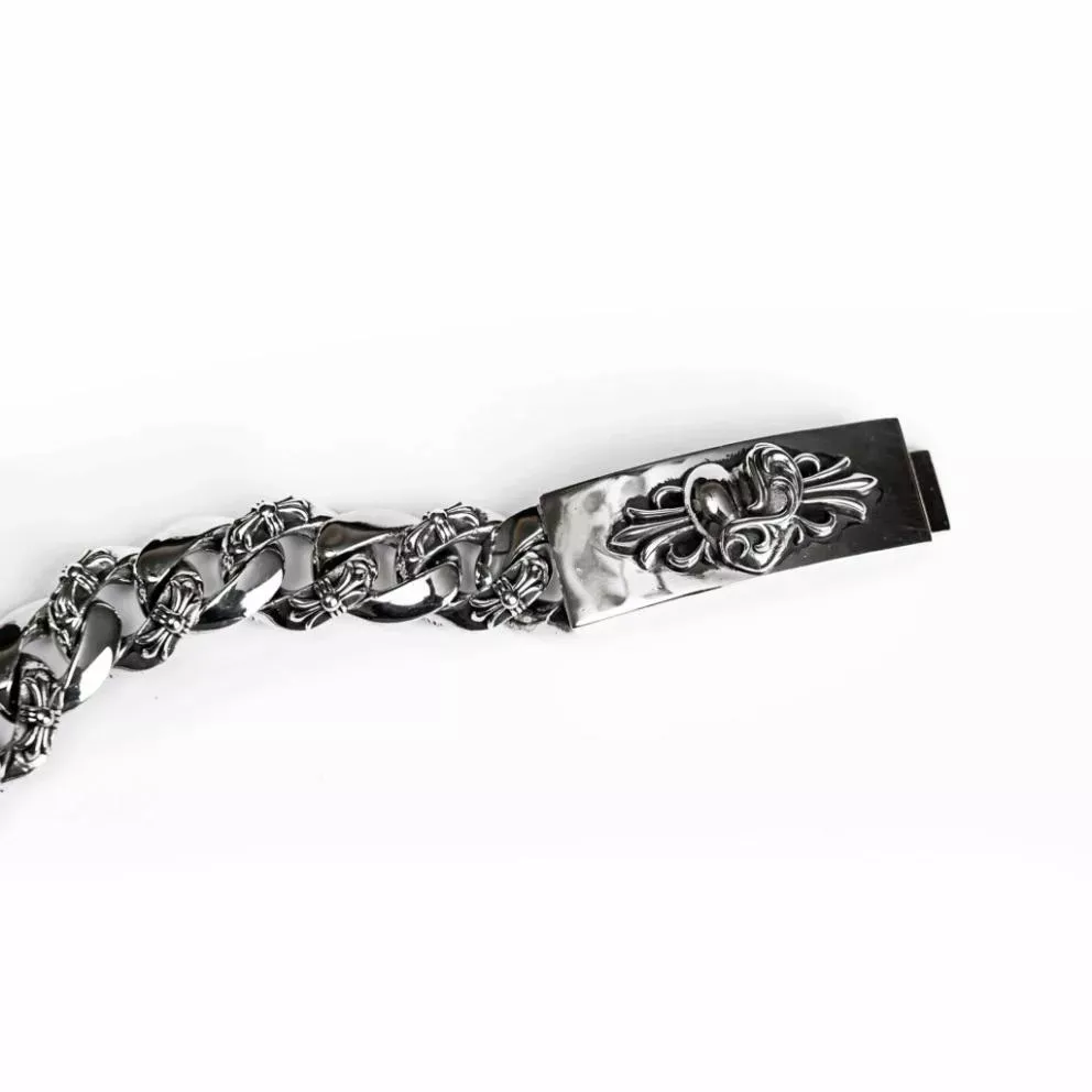 It makes sense that the majesty of modern jewelry would have its own insignia. This Heart Insignia ID Fancy Chain Bracelet by Chrome Hearts is a cut above with its elegantly engraved floral design and embellished chain.