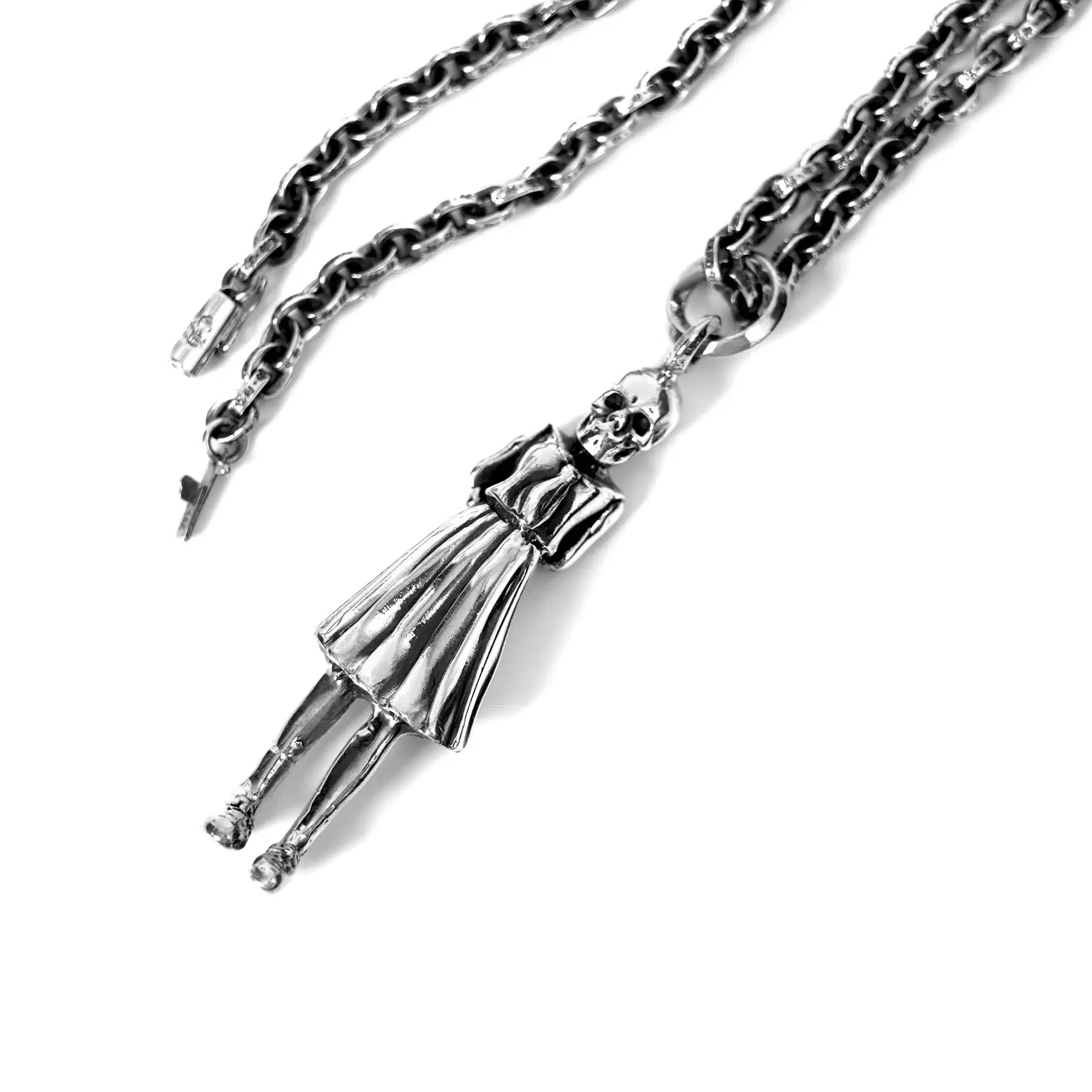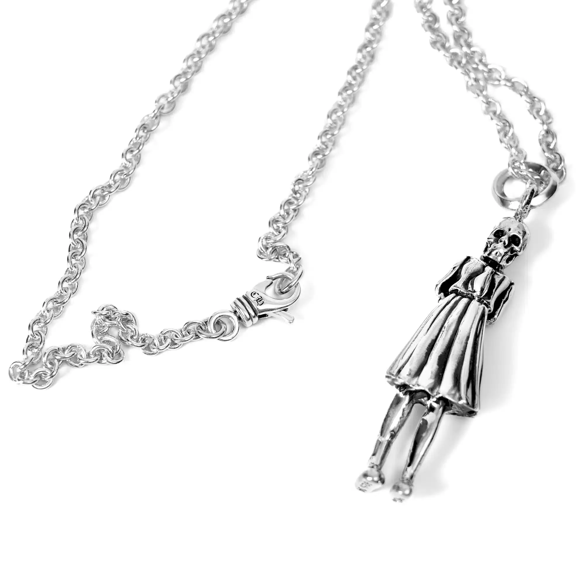 The Foti skippy pendant is a special collaboration product between the famous artist Joe Foti and Chrome Hearts. This large pendant shows a little girl with a skull.