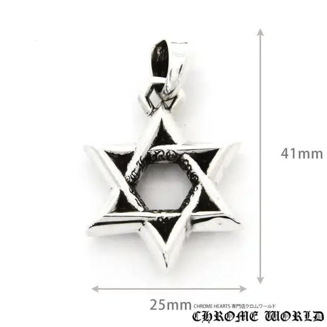 This small Star of David pendant derives its name from the star of David, which is the sacred symbol of Judaism. It is a hexagonal star with silver interconnections. The Chrome Hearts lettering is engraved on the inside of the star.