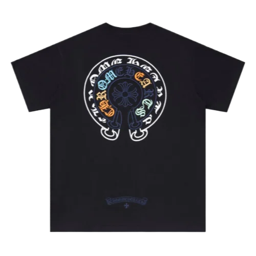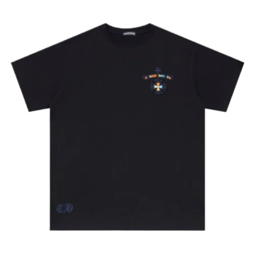 The Chrome Hearts 3 to 4 Color Embroidery Logo Black T-Shirt showcases luxury streetwear with a touch of vibrant detail, featuring a multi-colored embroidered logo for a bold and refined look.