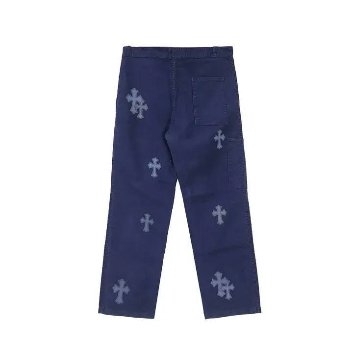 With multiple functional pockets and reinforced stitching, these pants blend practicality with luxury effortlessly. The signature blue leather cross patch on the back adds a pop of color, while subtle Chrome Hearts branding ensures the perfect amount of refinement. Whether you’re wearing them casually or dressing them up with a statement tee, these carpenter pants offer a perfect mix of street style and elevated craftsmanship.