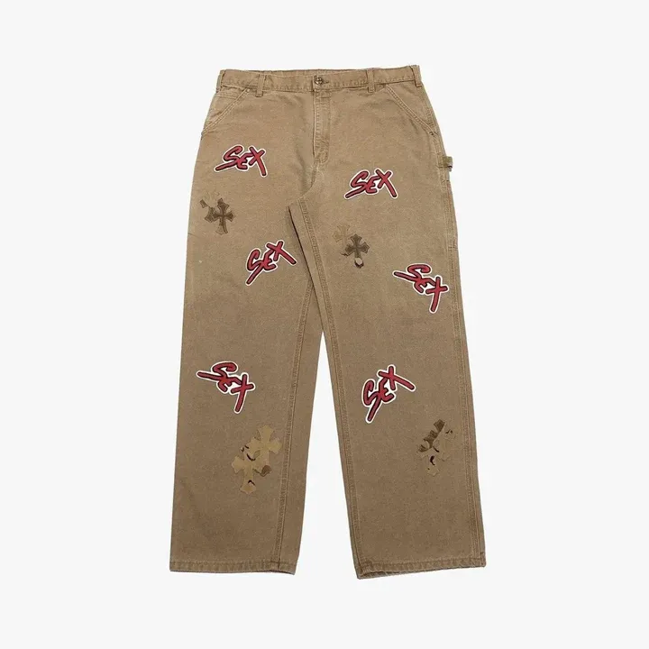The Chrome Hearts Carhartt Sex Record Limited Edition Khaki Carpenter Denim Jeans are an exclusive collaboration that fuses utilitarian workwear with luxury street style. Made from durable khaki denim, these jeans feature all the classic elements of Carhartt’s carpenter design, including functional side utility pockets and a hammer loop. The standout feature is the unique Sex Record branding, which adds an edgy, artistic touch, along with Chrome Hearts’ signature high-quality craftsmanship. With a relaxed fit and distinctive detailing, these jeans offer both practicality and high-fashion appeal, making them a must-have for any fashion-forward individual.