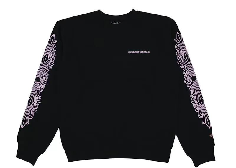Featuring a sleek black base, the crewneck is accented with vibrant pink Matty Boy graphics across the shoulders and signature Chrome Hearts detailing, delivering an unmistakable blend of luxury and edgy design. The relaxed fit and ribbed cuffs provide a comfortable silhouette, making it a must-have for any fan of high-end, artistic streetwear.