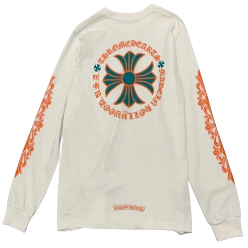 The Chrome Hearts Orange Maltese Cross White Long Sleeve T-Shirt combines the brand’s signature luxury aesthetic with a bold graphic design. Here are the key features: