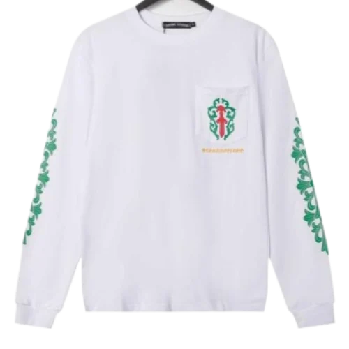 The Chrome Hearts Rose Cross Floral Vine Sword Long Sleeve T-Shirt is a bold and artistic masterpiece that showcases Chrome Hearts’ signature luxury streetwear with intricate and meaningful design elements. Featuring a detailed rose cross at the chest, intertwined with floral vine accents and a sword motif, this long sleeve tee merges gothic and classic elements, resulting in an elevated yet edgy aesthetic. Crafted from premium cotton, it ensures all-day comfort and durability while making a striking fashion statement. Perfect for those who want to stand out with a piece that blends high-end streetwear with deep, symbolic art.