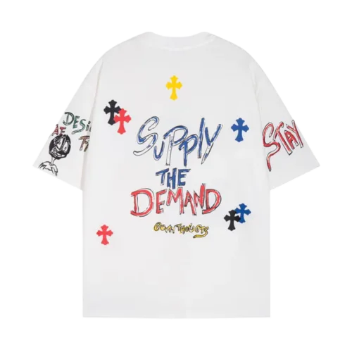 The Chrome Hearts Supply The Demand Cross Logo White Tee is a perfect fusion of luxury streetwear and bold, statement-making design, offering both comfort and style.
