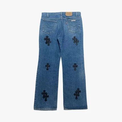 The Chrome Hearts Levi’s Blue Cross Patch Jeans are a premium collaboration that merges the timeless appeal of Levi’s with