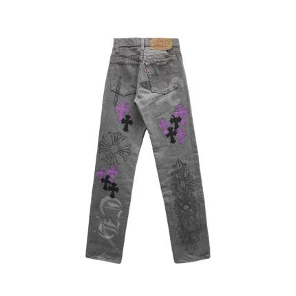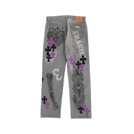 The Chrome Hearts Online Exclusive Wash Gray Spray Purple Cross Jeans offer a unique fusion of streetwear and luxury with