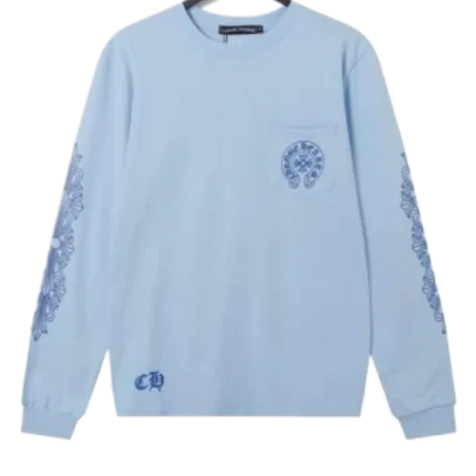 The Chrome Hearts Blue Sanskrit Long Sleeve T-Shirt is a captivating piece that fuses the brand’s iconic luxury streetwear aesthetic