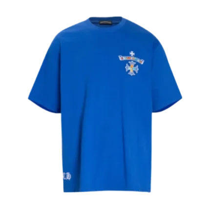 The Chrome Hearts Multicolor Embroidery Logo Blue T-Shirt offers a fresh, vibrant take on luxury streetwear, featuring a bold, multicolored