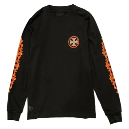 The Chrome Hearts Orange Maltese Cross Black Long Sleeve Tee is a bold and exclusive piece that combines the luxury