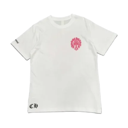 The Chrome Hearts Pink Holographic Cross T-Shirt is a striking streetwear piece that combines bold design with the high-end craftsmanship